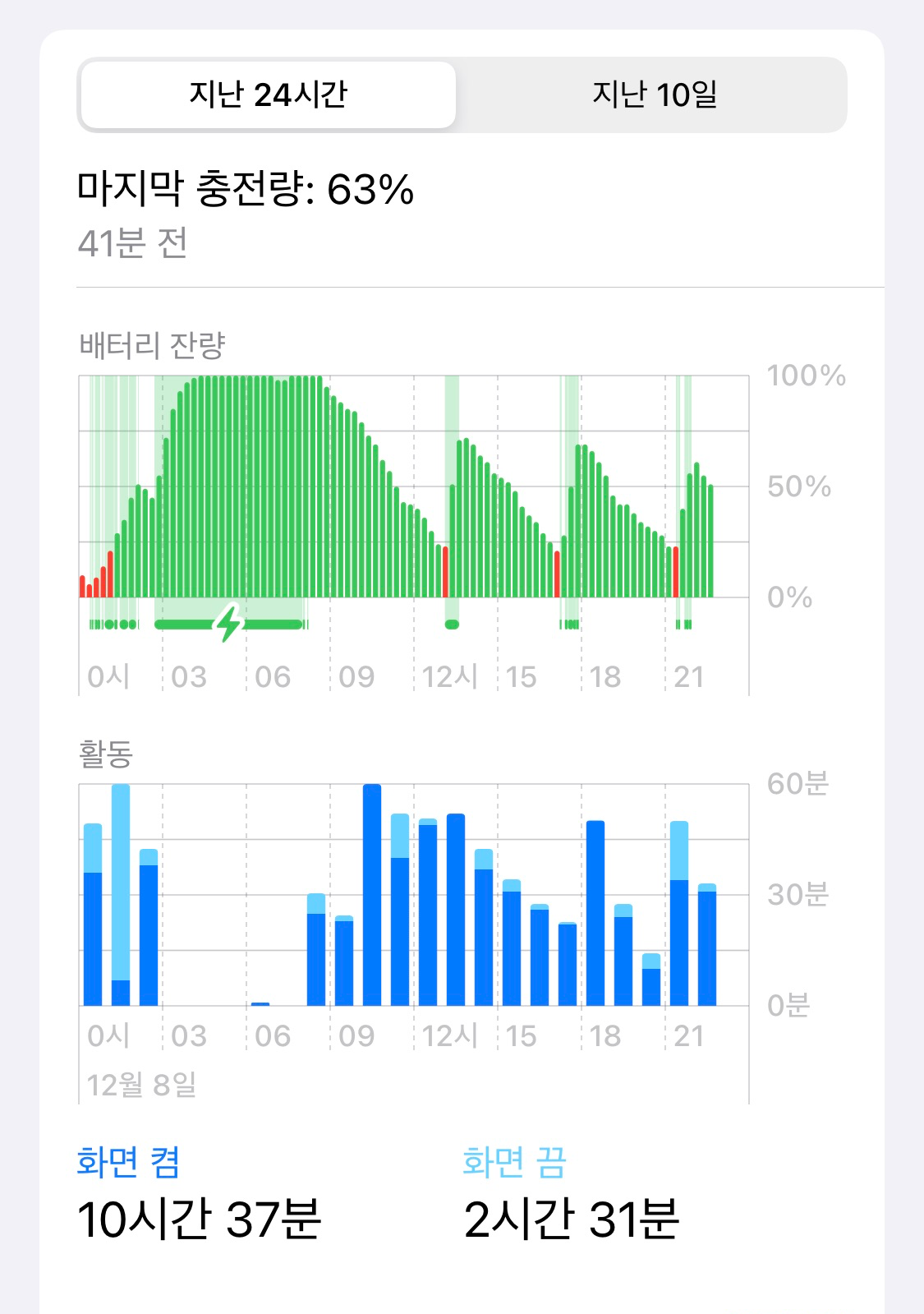 이제는 배터리가 60% 아래로만 떨어져도 언제 방전이 될까 불안해하며 사용하지 않아도 된다. 보통 일상적으로 하루 정도를 사용했을때 배터리 소모량은 75% 정도인 것 같다. 보조배터리 없이도 하루는 충분히 버틴다.