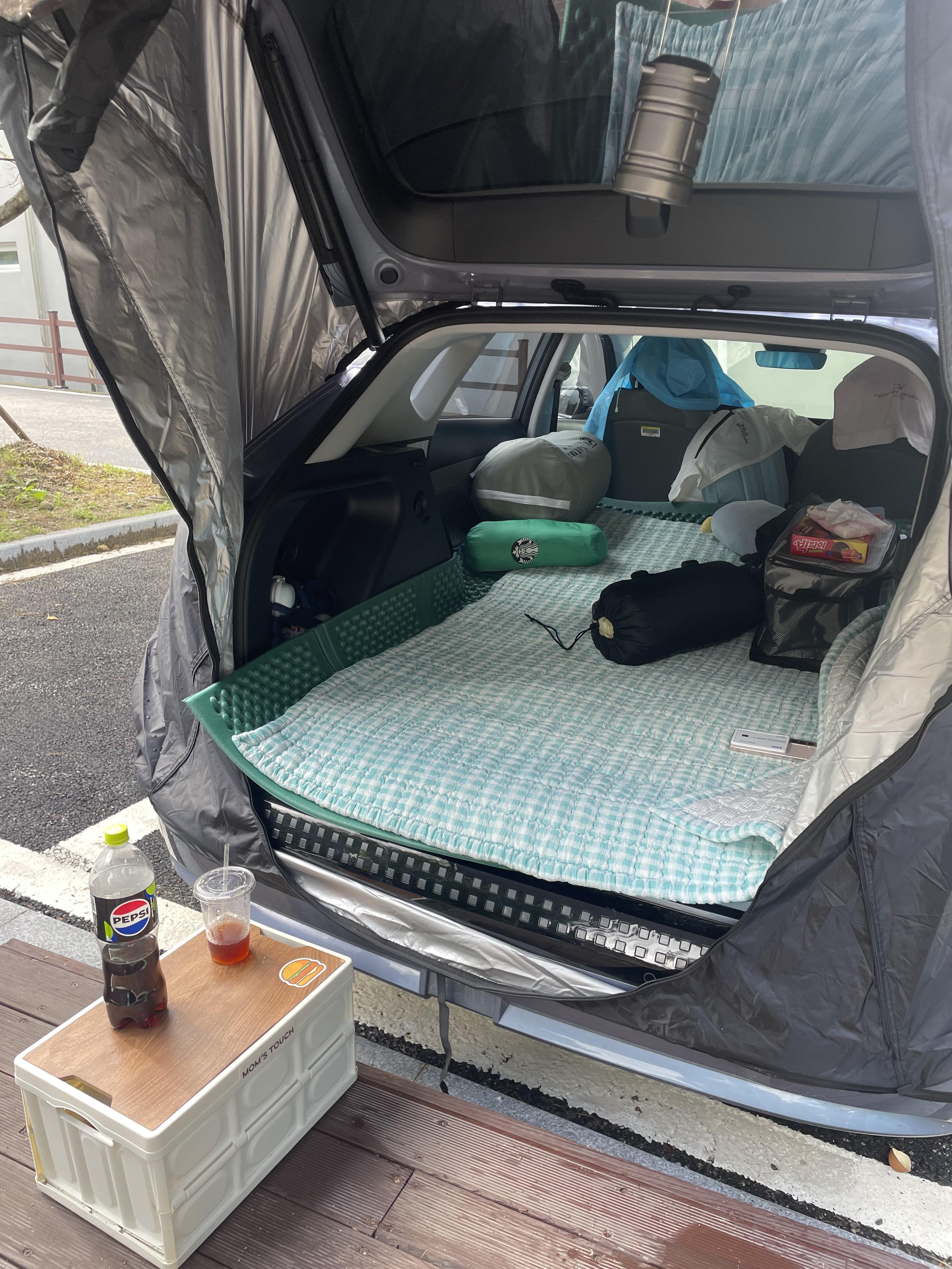 따로 캠핑 전용 에어매트나 장비 따로 없이, 집에서 쓰는 이불 하나와 꼬리텐트, 가스 버너와 침낭, 토트박스 정도만 가지고 캠핑을 왔는데, 확실히 차박은 큰 텐트가 필요 없어 짐이 줄어든다는거도 정말 큰 장점인 것 같다.