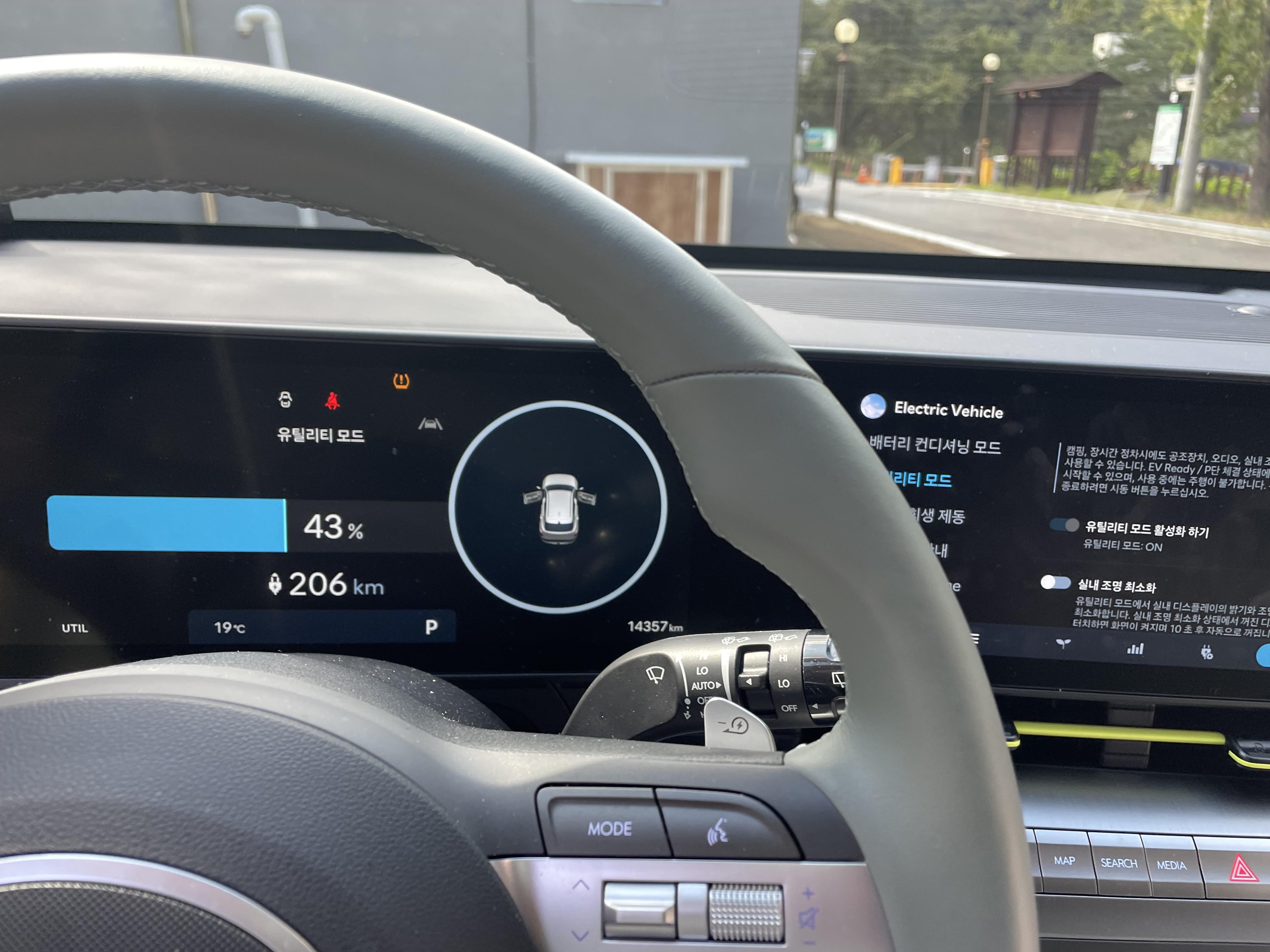27일 저녁 7시부터 28일 낮 12시까지 유틸리티 모드를 사용하는 동안 실내 공조와 V2L을 통해 약 10% 정도의 배터리를 사용했다. 56km 정도를 주행할 수 있는 전기를 사용했다.
