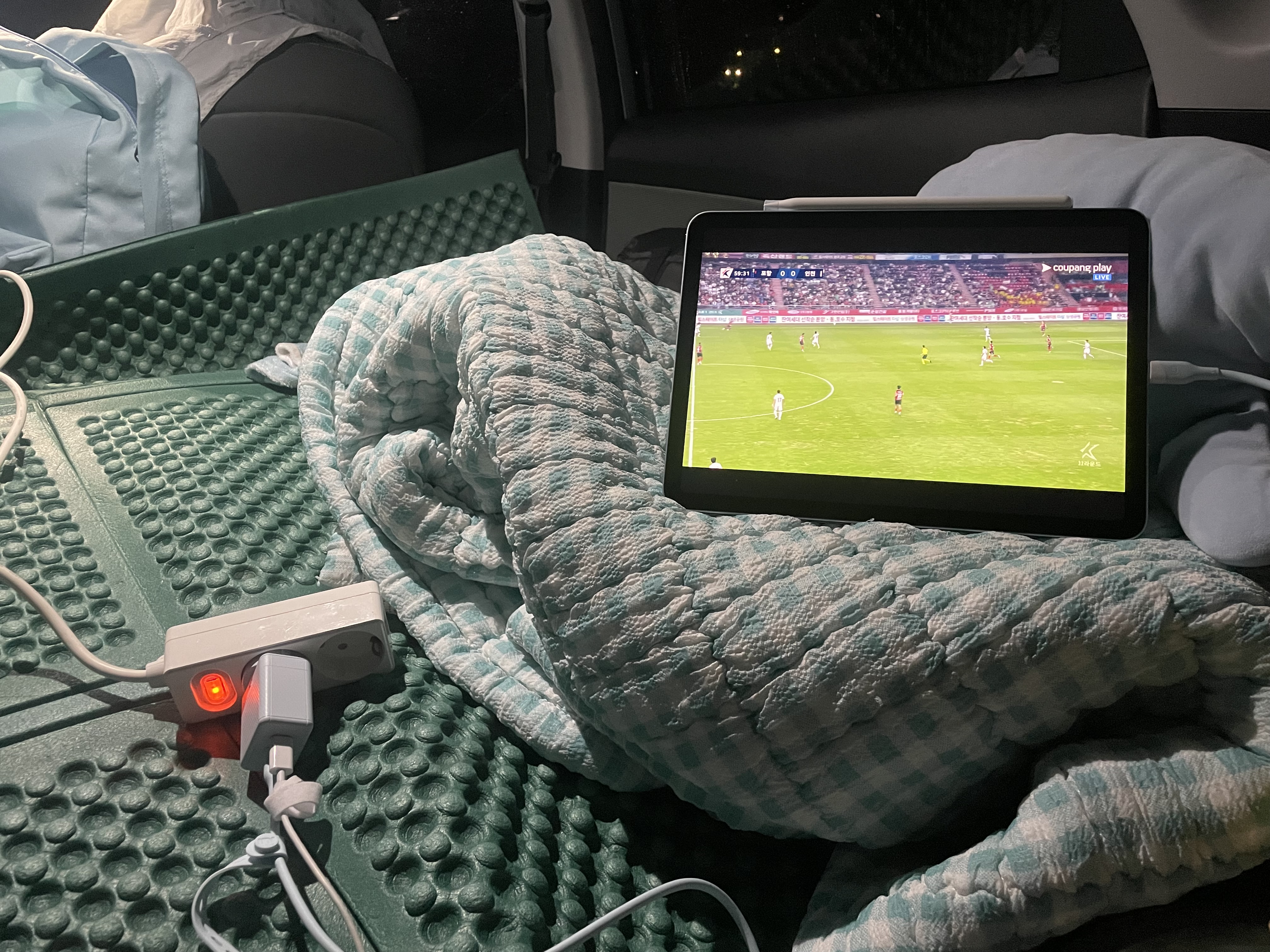 덕분에 4천원을 주고 추가해야하는 캠핑장 전기 옵션을 사용하지 않아도 된다. 돈 굳었다. 자기 전 태블릿으로 축구를 보고 핸드폰을 충전하고, 샤워를 마친 뒤 V2L을 통해 헤어드라이기를 사용할 수 있었다.