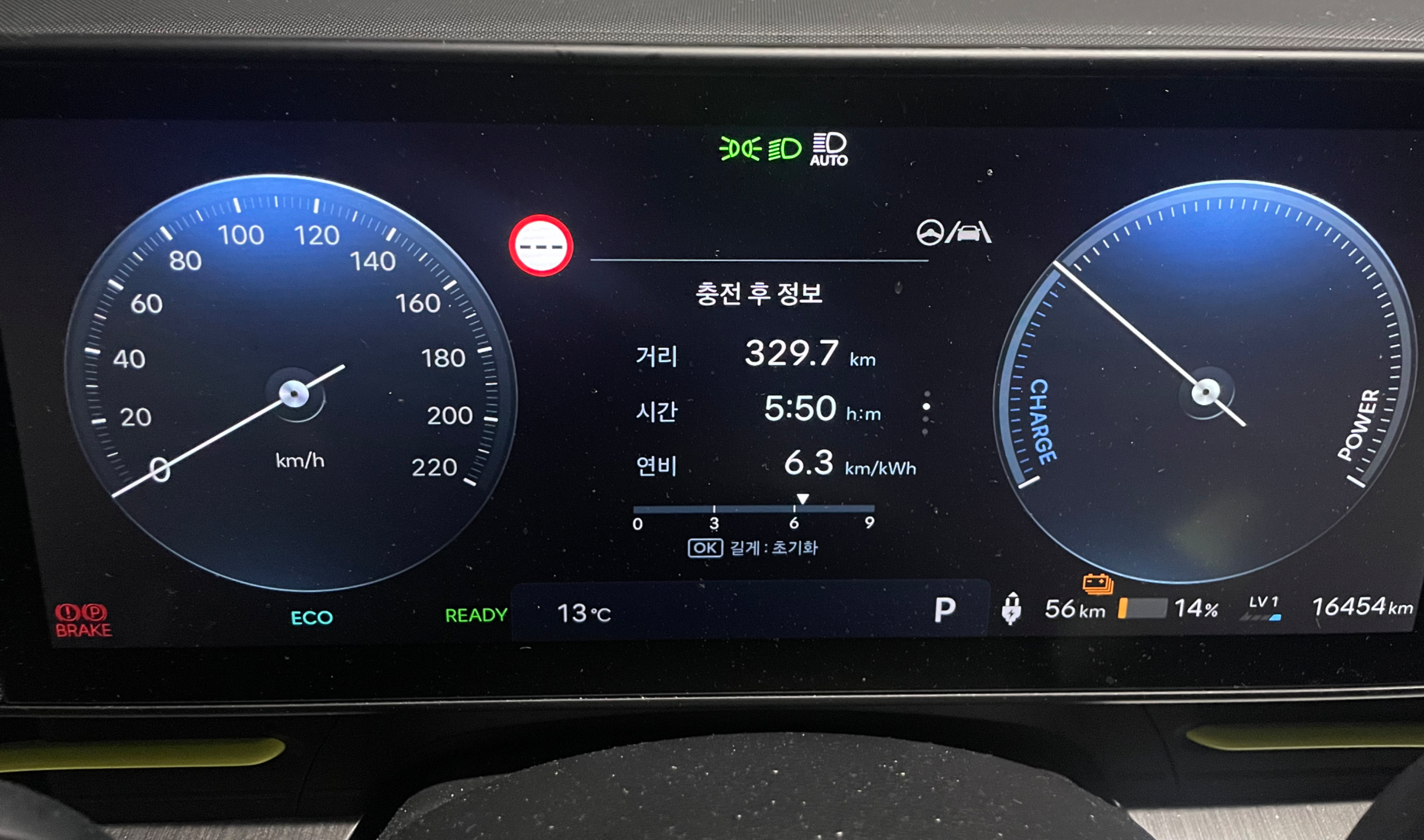 목적지인 안산에 위치한 아파트 주차장의 완속 충전기 앞에 도착 후, 계기판 트랩 상 329.7km 주행, 남은 주행거리는 56km였습니다.
