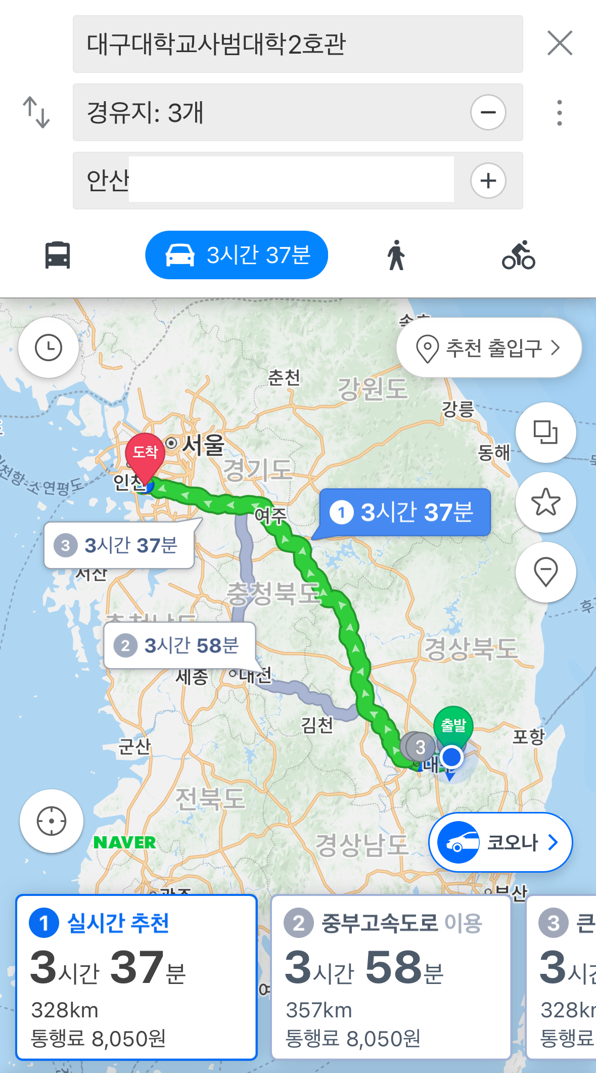 네이버 지도 상으로 주행한 경로를 경유지로 지정 해 본 결과 328km로, 주차를 하는 동안 이동한 거리를 고려하면 계기판 트립 상 주행거리는 거의 정확해 보입니다.