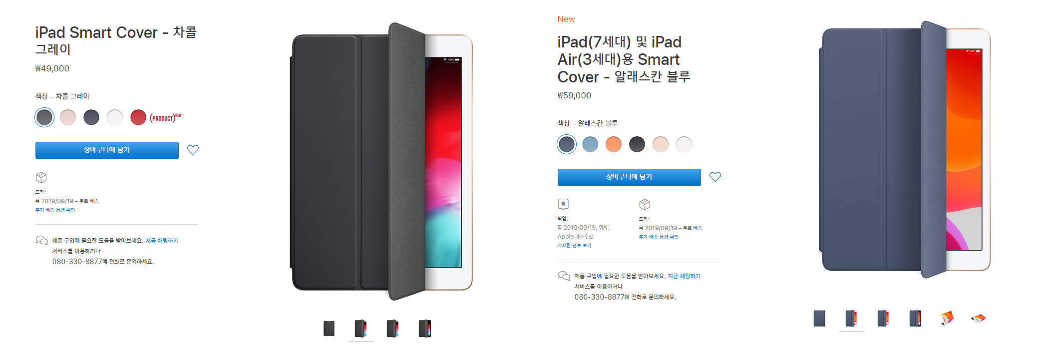 스마트 커버는 기존 9.7인치 모델의 스마트 커버는 4만9천원이었지만, 아이패드 7세대 10.2인치 모델과 아이패드 프로2, 아이패드 에어 3와 호환되는 스마트 커버는 5만9천원이죠.