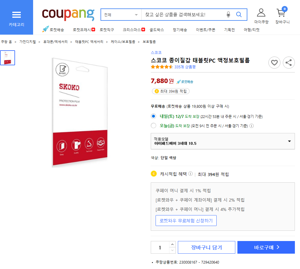 쿠팡에서 스코코 종이질감 필름을 구매했는데, 가격도 저렴하고 무료배송에 로켓배송까지 가능해 주문한 다음날 바로 받을수 있어 좋았습니다.
