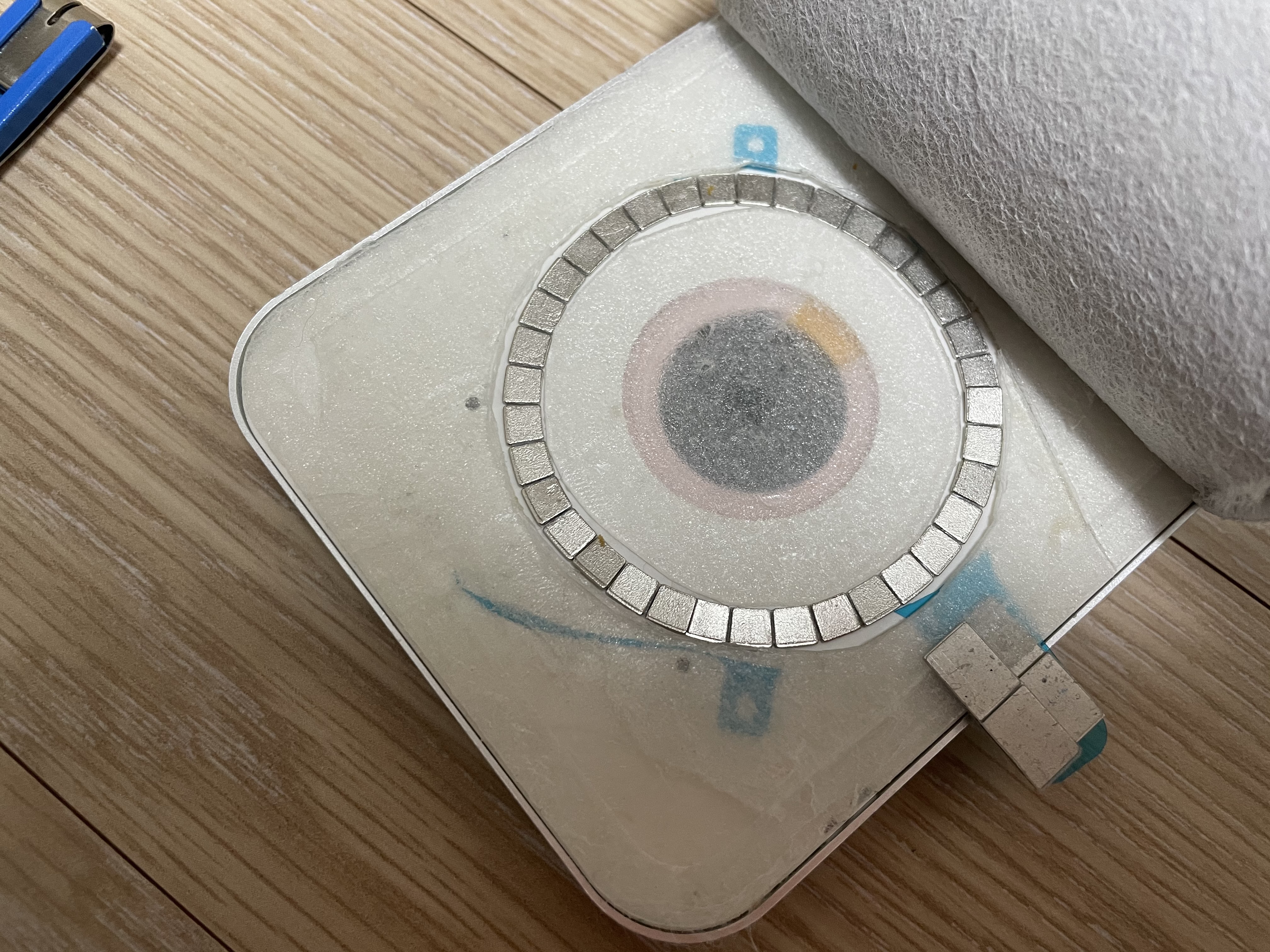 그러던 중 예전에 호기심에 구매해 봤던 맥세이프 자석 스티커가 생각이 났다. 구매 후 쓸 일이 없어서 책상 속에만 방치해 뒀었는데, 이 무선 충전 패드에 맥세이프 자석을 넣으면 편하게 사용할 수 있겠다는 생각이 들었다.