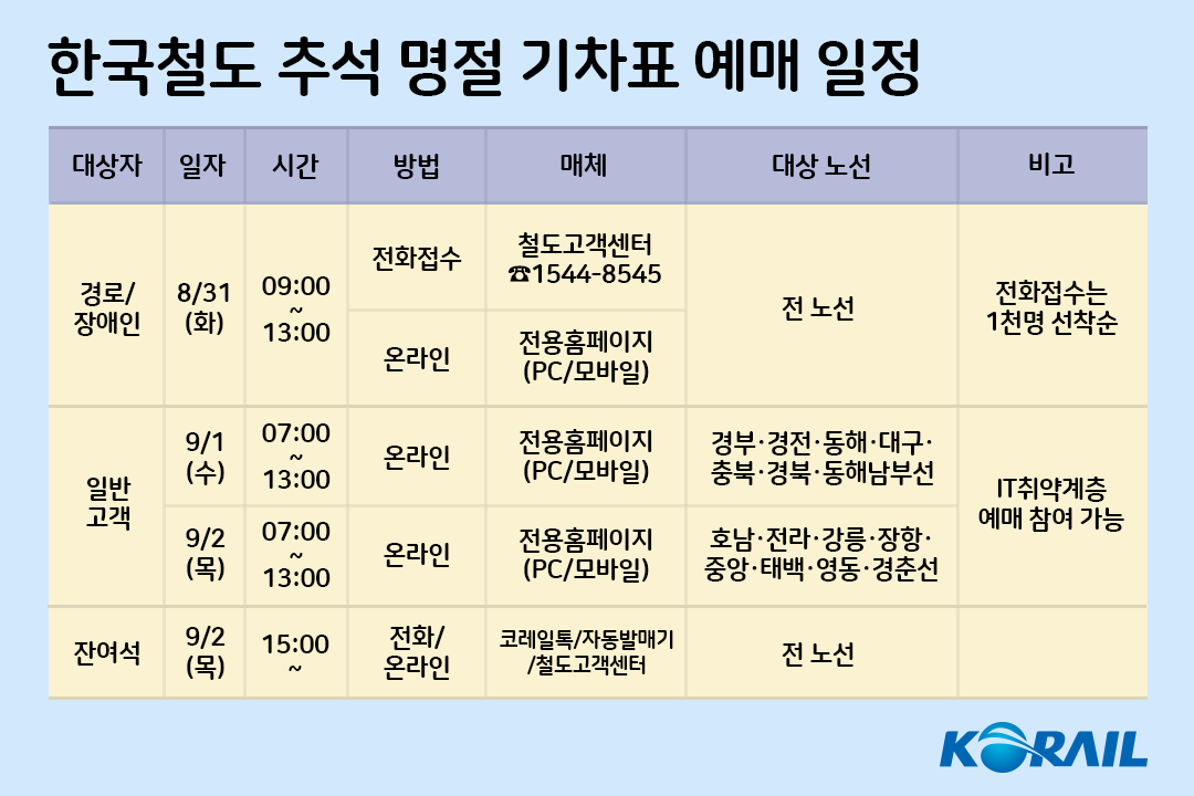 일반 고객을 대상으로는 9월 1부터 추석 명절 기차표 예매가 시작됩니다.