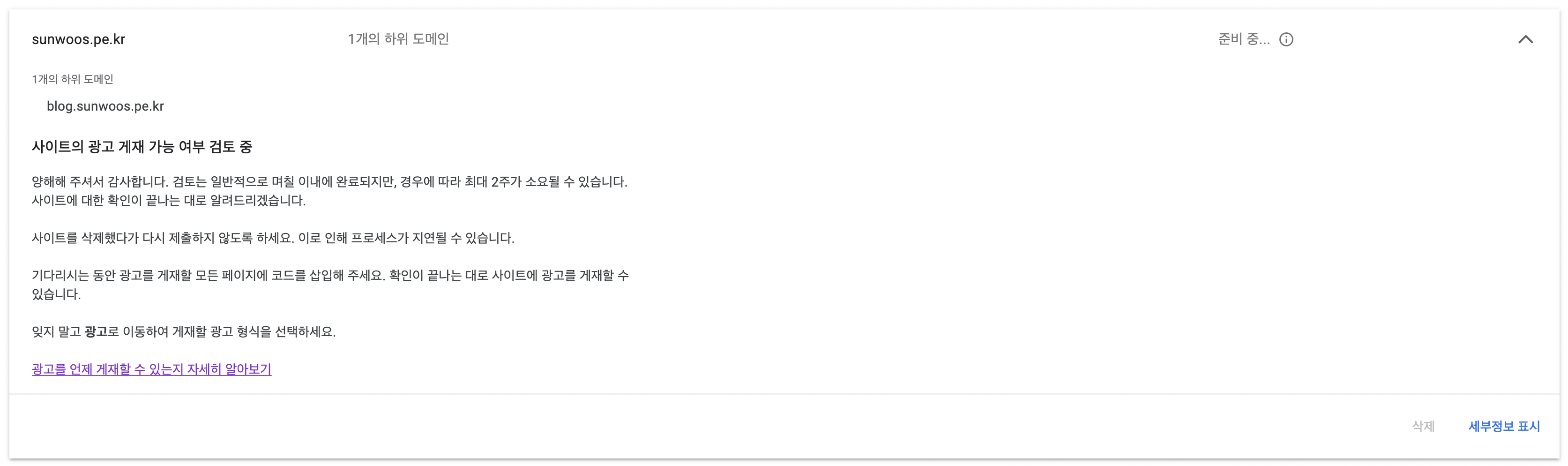 심지어 사이트를 새로 추가하는게 아니라 주소만 바꾸는 데에도 변경한 주소에서 광고가 게시될 때 까지 시간이 걸린다는게 너무 규정이 빡빡하지 않은가 싶다.