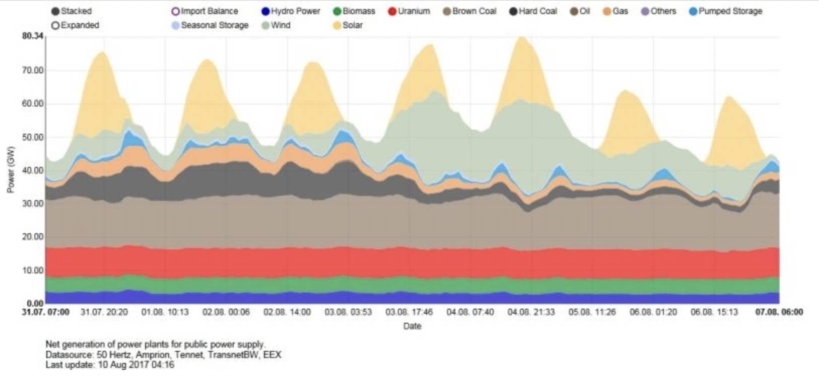 태양광 발전 도입의 가장 성공적인 사례로 꼽히는 독일을 보아도 이를 알 수 있다. 한낮에는 태양광 에너지 발전량이 가장 많고 그만큼 전기 사용량도 많다. 그러나 아침저녁으로 일조량이 적을 때에는 석탄화력발전(Coal)이 증가하는 것을 볼 수 있다.