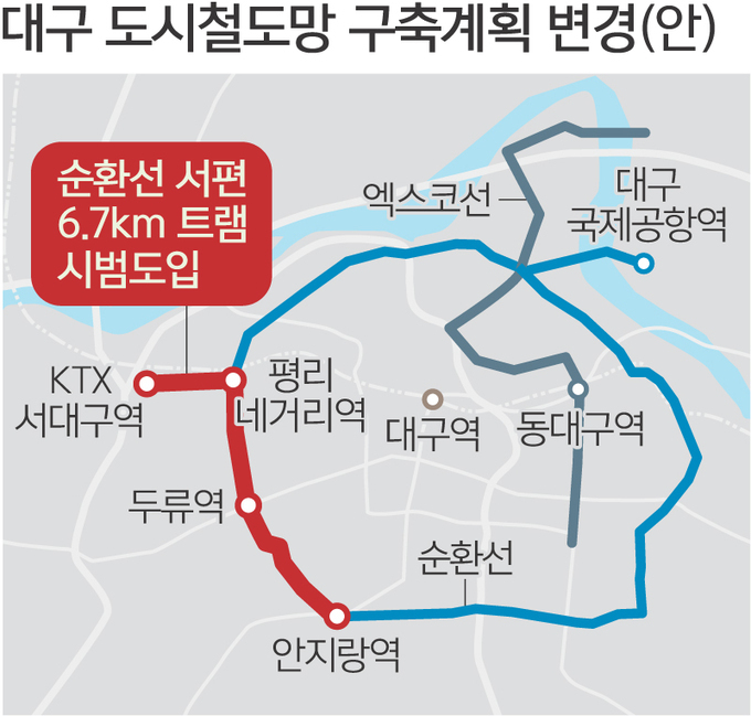 서대구역에는 대구산업선 뿐만 아니라 대구 도시철도 순환선 트램도 예정되어 있습니다. 순환선 구간 중 일부인 안지랑역~서대구역 구간이 우선 추진될 예정으로, 순환선을 통해 남구에서도 서대구역까지 편리하게 접근이 가능해집니다.