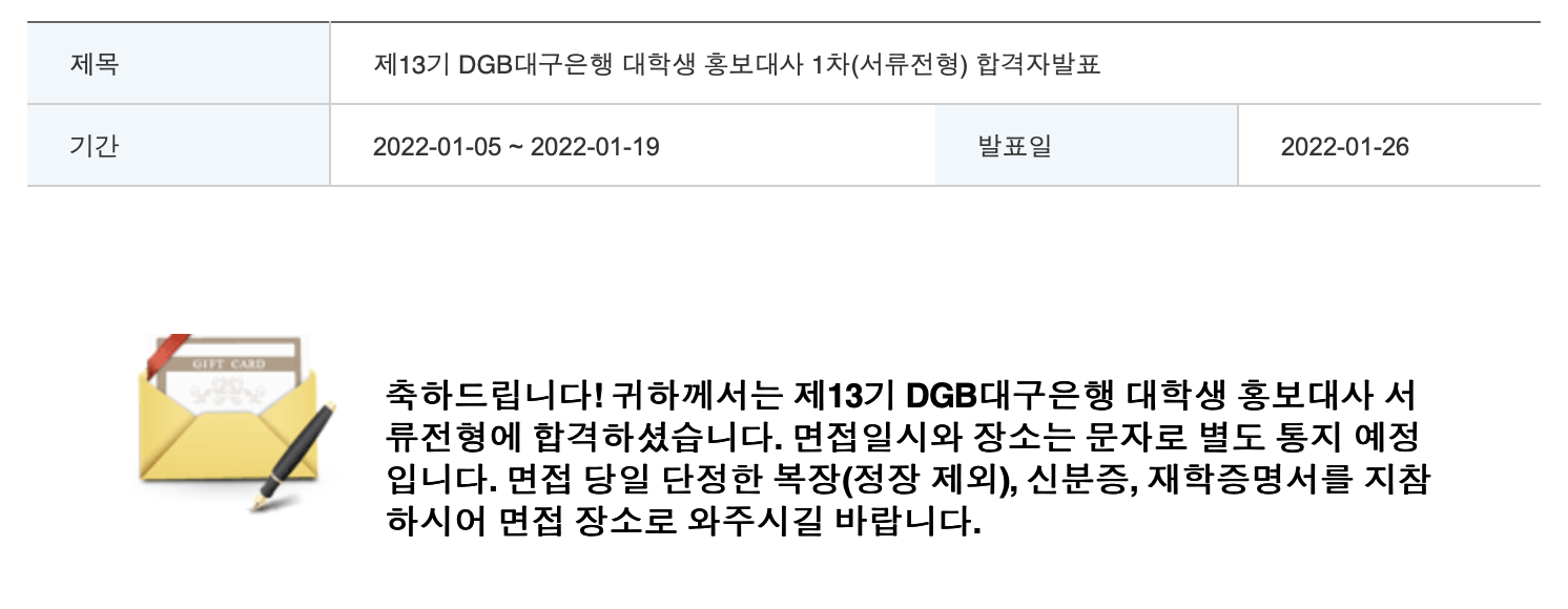 이번에 DGB대구은행 대학생 홍보대사 대대홍 13기에 합격하게 되어, 합격 소감과 면접 후기를 간단하게 알려드리고자 합니다.